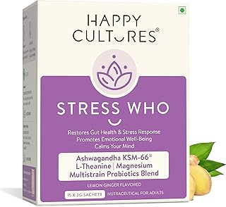 Happy Cultures Stress Who – Ashwagandha KSM66, Magnesium & L-Theanine, Probiotics blend, Anxiety & Stress Relief For Men & Women | Supports Relaxation | Clinically tested, No Side Effects | Lemon & Ginger Flavored – 15 x 2g (Sachets)