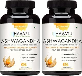 HAVASU Organic Ashwagandha Root with Black Pepper | 60 Capsules 800mg | Natural Stress & Mood Relief, Sleep Aid, Thyroid Support Supplement; Ayurvedic Nootropic for Focus & Energy, Pack 2